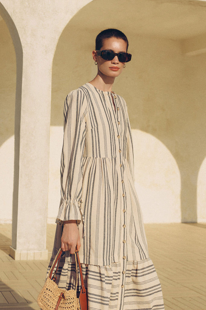 NATUREL DOKULU ÇİZGİLİ ELBİSE