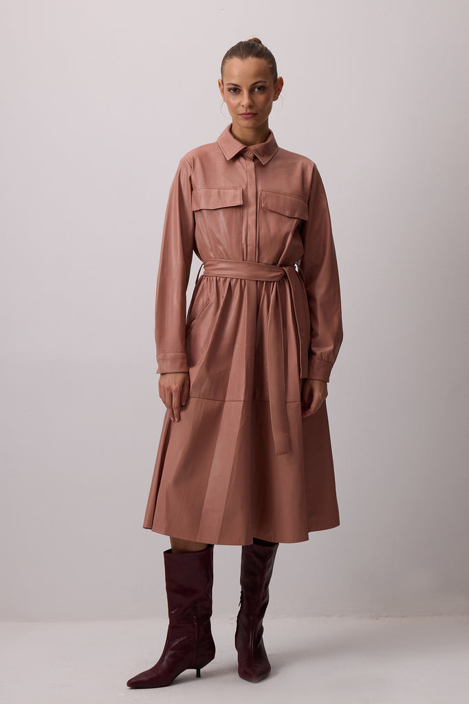 ÖNÜ CEPLİ UZUN DERİ ELBİSE